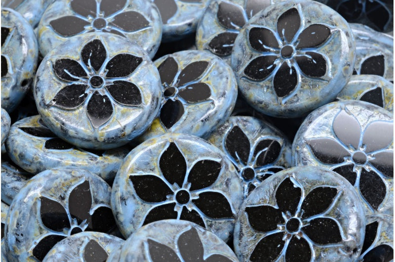 テーブルカットコインフラワービーズ、ブラックトラバーチンブルースポット(23980-86800-33308)、ガラス、チェコ共和国