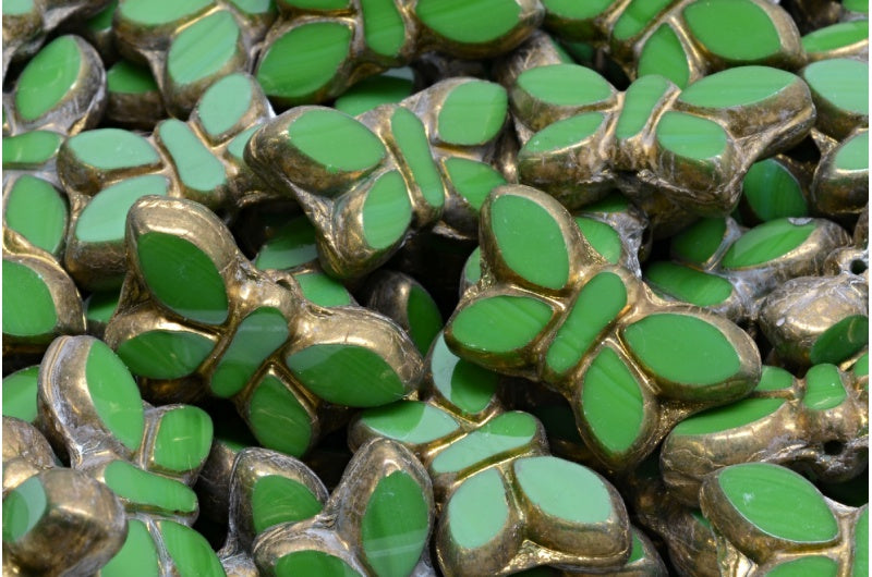 テーブルカットバタフライビーズ、不透明グリーン真鍮(53330-90215)、ガラス、チェコ共和国