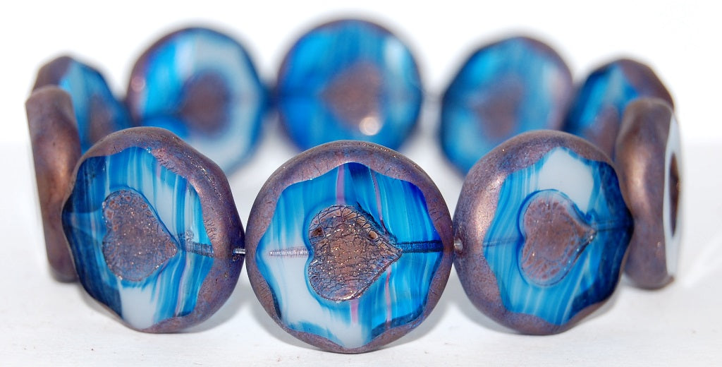 テーブルカットラウンドビーズ(ハート付き)、ライトブルーホワイトディレイブロンズ(65016-14415)、ガラス、チェコ共和国
