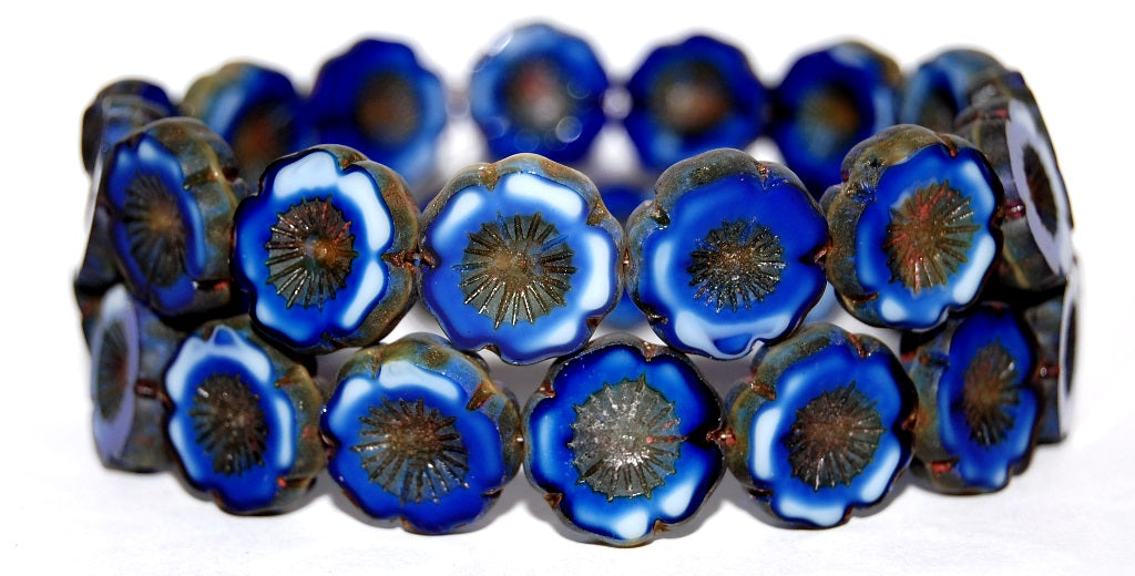 テーブルカットラウンドビーズ ハワイアンフラワー、ブルーホワイトミックストラバーチン(37005-86800)、ガラス、チェコ共和国