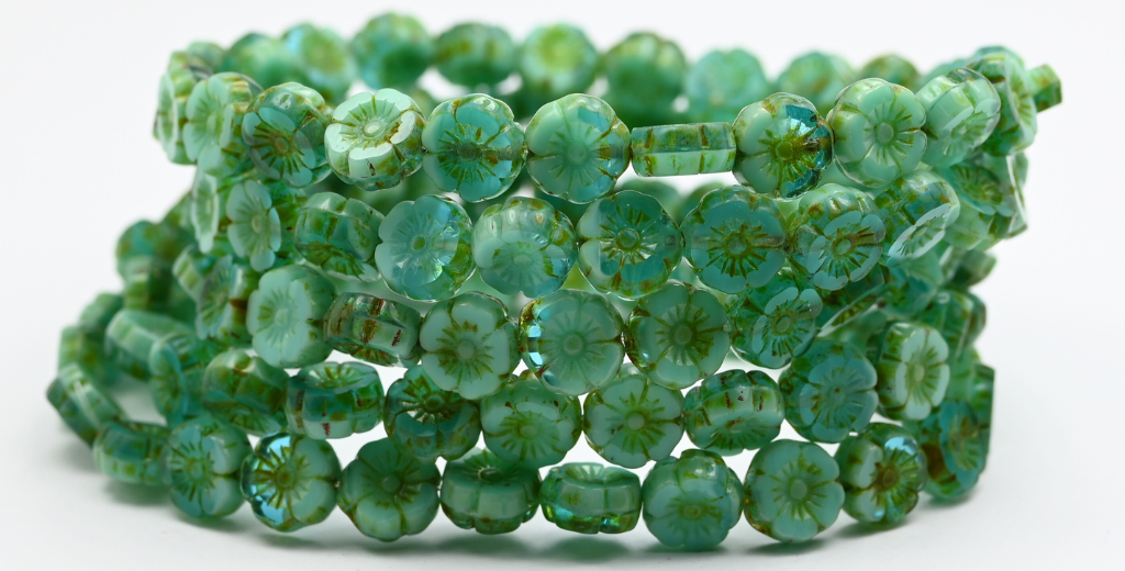 テーブルカットラウンドビーズハワイアンフラワー、透明アクアターコイズトラバーチン(60020-63130-86800)、ガラス、チェコ共和国~STRANDED