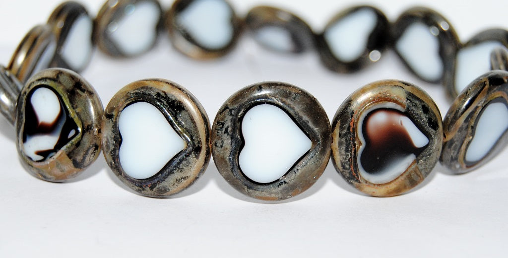 テーブルカットラウンドビーズ(ハート付き)、ブラウンホワイトピカソ(17025-43400)、ガラス、チェコ共和国
