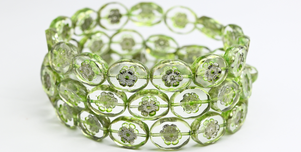 テーブルカットオーバルビーズ(花付き)、クリスタルライトグリーン(00030-34310)、ガラス、チェコ共和国