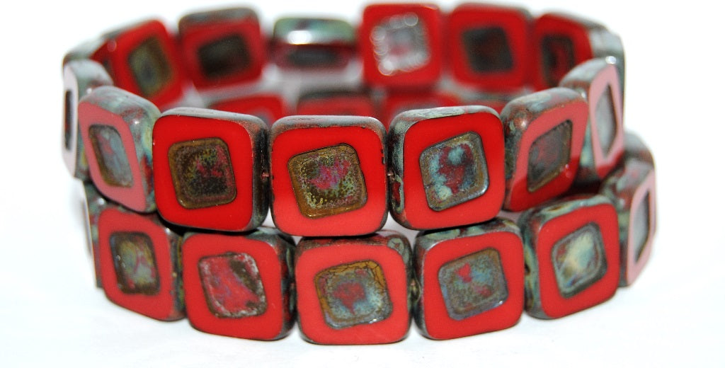 テーブルカットスクエアビーズ、ターンドスクエア、不透明レッドトラバーチン(93200-86800)、ガラス、チェコ共和国