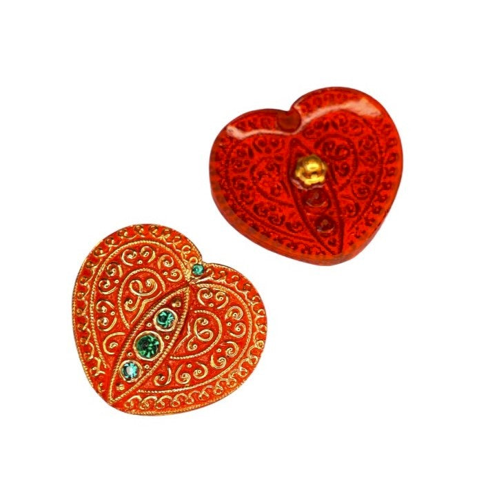 1個 ハンドペイントガラスボタン ハート 飾り付き、サイズ18 (33x33 mm)、ガラス、チェコ共和国