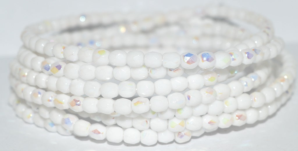 ファイヤーポリッシュラウンドファセットビーズ、チョークホワイトAB(03000-AB)、ガラス、チェコ共和国〜STRANDED