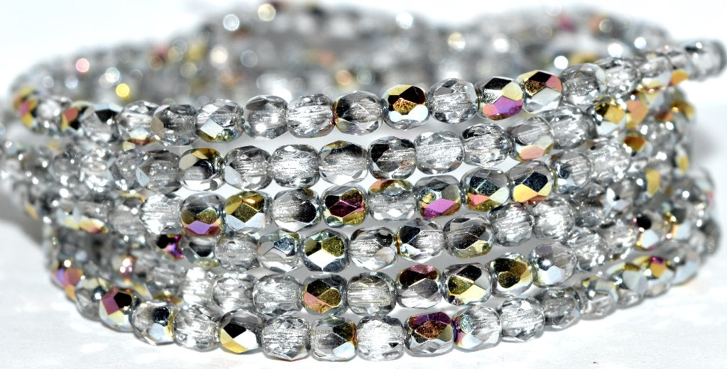 ファイアポリッシュラウンドファセットビーズ、シルバーヴィトレイル(28002)、ガラス、チェコ共和国〜STRANDED