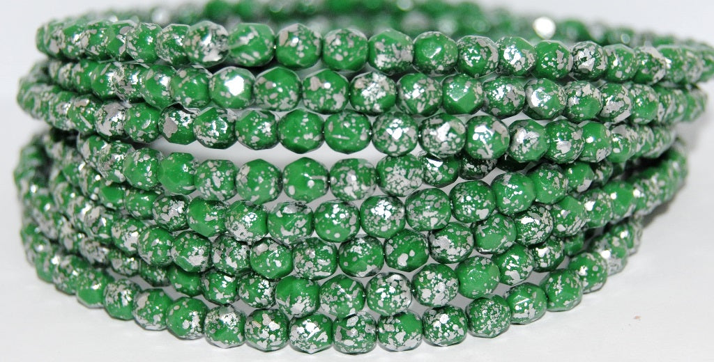 ファイアポリッシュラウンドファセットビーズ、不透明グリーンシルバースプラッシュ(53300-94400)、ガラス、チェコ共和国