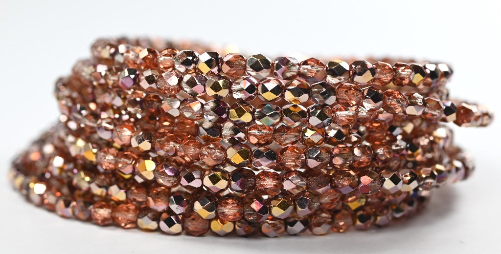 ファイアポリッシュラウンドファセットビーズ、透明ピンクローズゴールドカプリ(70110-27101)、ガラス、チェコ共和国