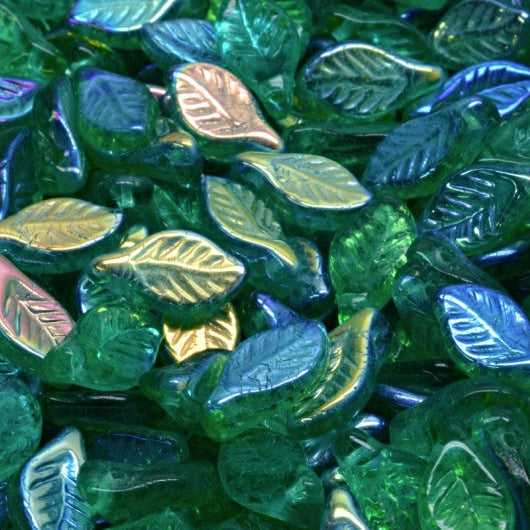 アウトレット 10グラム ベイリーフビーズ、6 x 12 mm、透明グリーンエメラルドAb(50720-28701)、ガラス、チェコ共和国