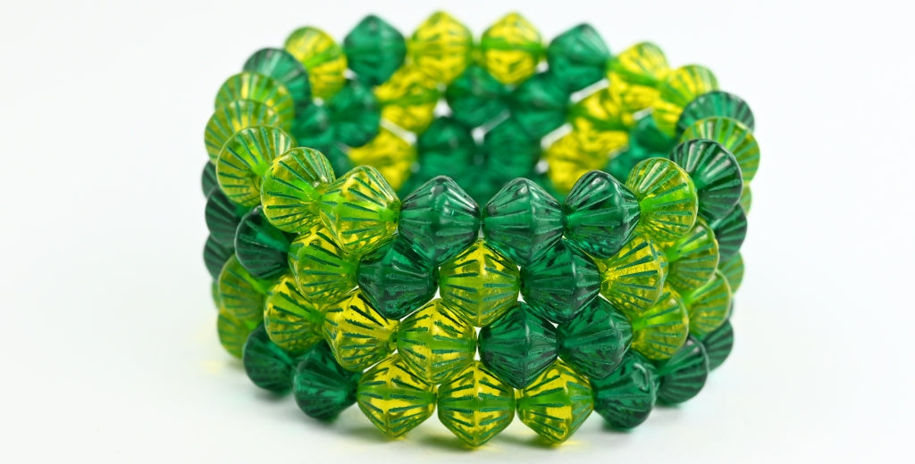 ランタンバイコーンプレスガラスビーズ、ミックスカラーグリーングリーンライン(MIX GREEN-46450)、ガラス、チェコ共和国