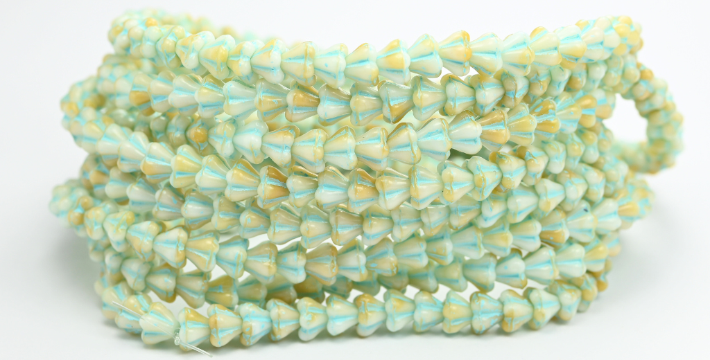 ベルフラワープレスガラスビーズ、ダークベージュライトブルーライン(07193-54308)、ガラス、チェコ共和国~STRANDED