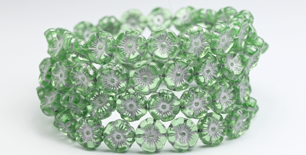 ハワイの花の押しガラスビーズ、透明グリーン、シルバーライン(50800-54201)、ガラス、チェコ共和国