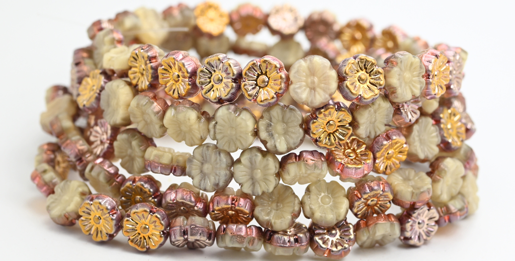 ハワイアンフラワー プレストガラスビーズ、ベージュシルキーローズゴールドカプリ(16017-27101)、ガラス、チェコ共和国