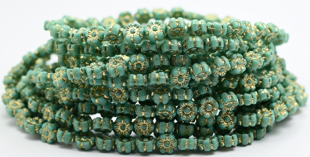 ハワイの花の押しガラスビーズ、不透明グリーンゴールドライン(53130-54202)、ガラス、チェコ共和国~STRANDED