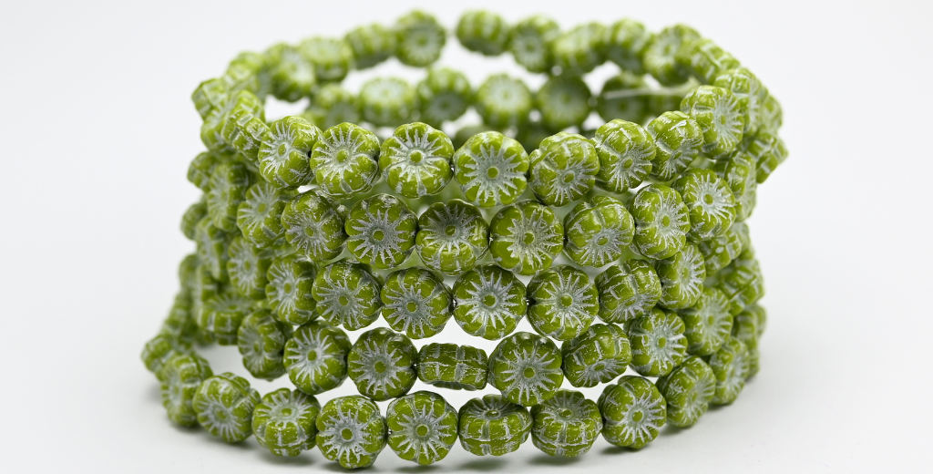 ハワイアンフラワー プレスガラスビーズ グリーンホワイトライン入り (53420-54312) ガラス製 チェコ共和国 ~ STRANDED