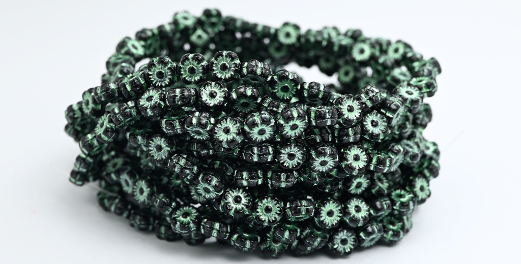 ハワイアンフラワー プレスガラスビーズ、ブラックグリーンライン(23980-54322)、ガラス、チェコ共和国