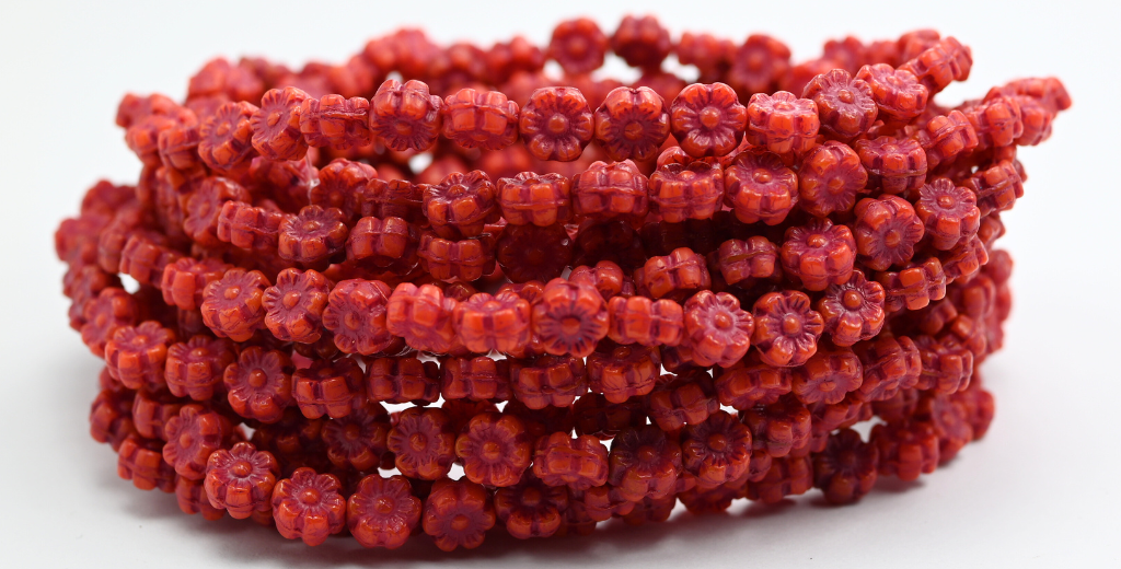 ハワイの花の押しガラスビーズ、オパールレッド、赤のライン入り(91240-46490)、ガラス、チェコ共和国~STRANDED