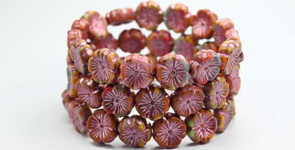 ハワイアンフラワー プレストガラスビーズ ミックスカラー ブラウン ピンクライン入り (MIX-BROWN-54321) ガラス チェコ共和国 ~ STRANDED