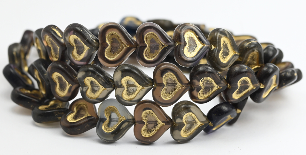 ハート型プレスガラスビーズ、ミックスカラー、ダークゴールドライン(MIX-DARK-54202)、ガラス、チェコ共和国