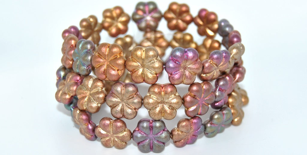 6枚の花びらの花の押しビーズ、バイオレットレインボーメタリックアイリス(01640)、ガラス、チェコ共和国〜STRANDED
