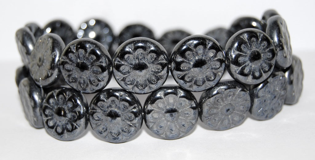 フラットラウンドフラワープレスガラスビーズ、ブラックヘマタイト(23980-14400)、ガラス、チェコ共和国~STRANDED