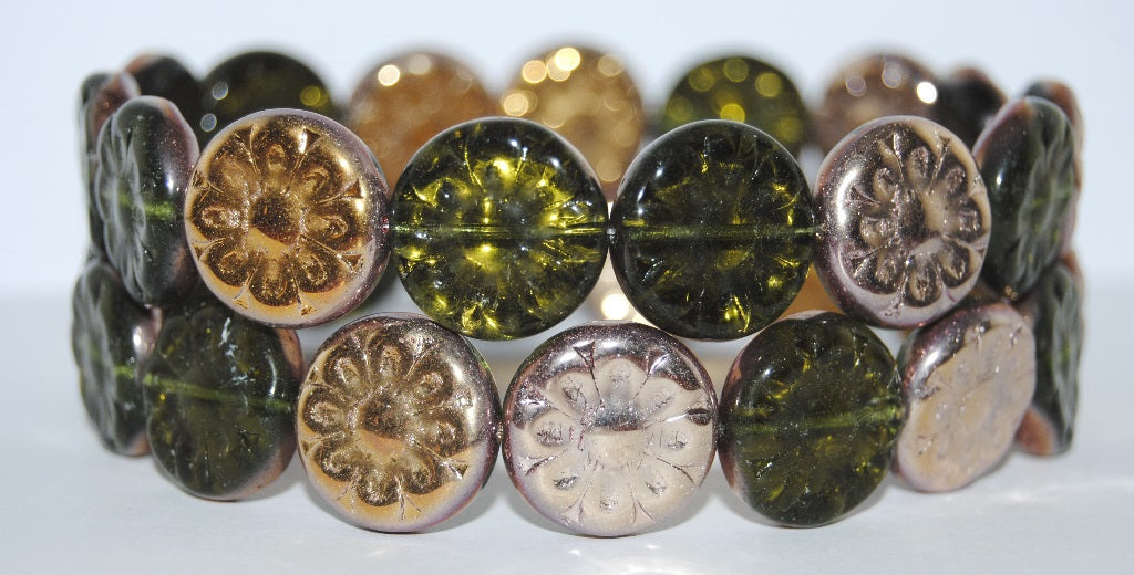 フラットラウンドフラワープレスガラスビーズ、透明グリーンローズゴールドカプリ(50230-27101)、ガラス、チェコ共和国〜STRANDED