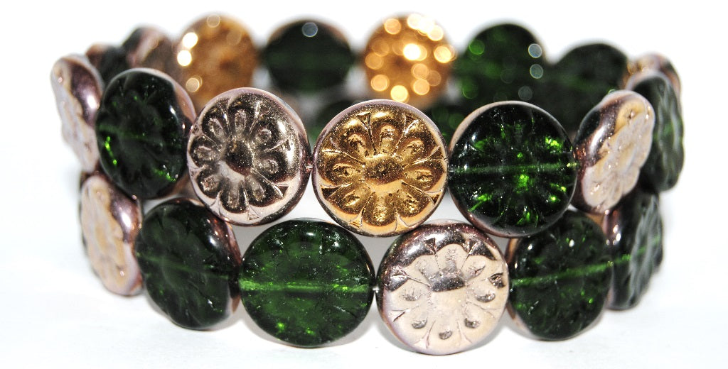 フラットラウンドフラワープレスガラスビーズ、透明グリーンエメラルドローズゴールドカプリ(50720-27101)、ガラス、チェコ共和国〜STRANDED