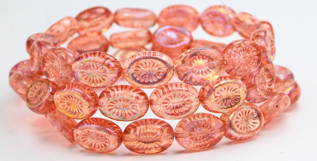 オーバルキウイプレスガラスビーズ、クリスタルライトピンクピーチAB(00030-34305-AB)、ガラス、チェコ共和国