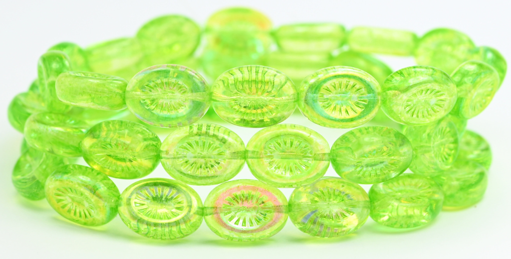 オーバルキウイプレスガラスビーズ、クリスタルライトグリーンAb(00030-34310-AB)、ガラス、チェコ共和国