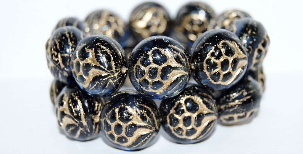 丸型押しガラスビーズ(花柄)、透明ダークブルー、ゴールドライン(30320-54202)、ガラス、チェコ共和国