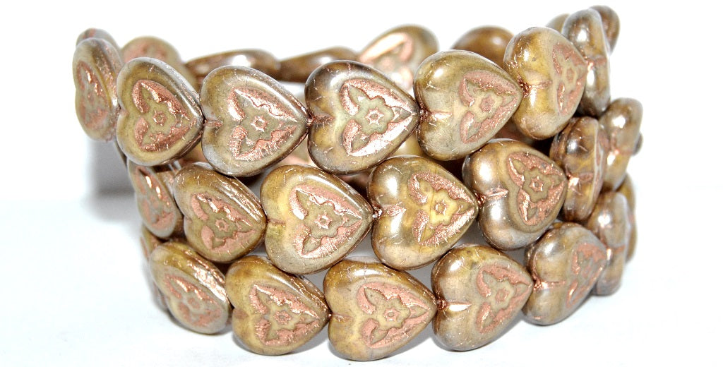 ハート型押しガラスビーズ(花付き)、ホワイト43個入り(銅線入り)(02010-43-54200)、ガラス、チェコ共和国