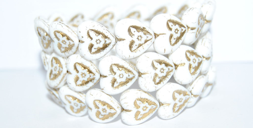 ハートと花のプレスガラスビーズ、チョークホワイトゴールドライン(03000-54202)、ガラス、チェコ共和国