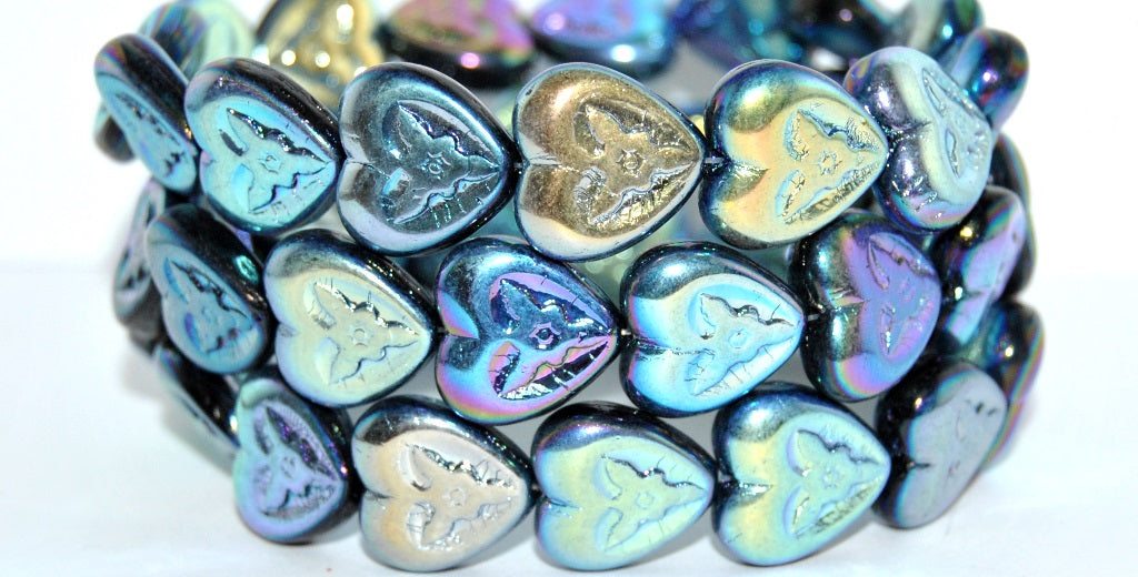 ハートと花のプレスガラスビーズ、ブラックAb 2Xside(23980-AB-2XSIDE)、ガラス、チェコ共和国