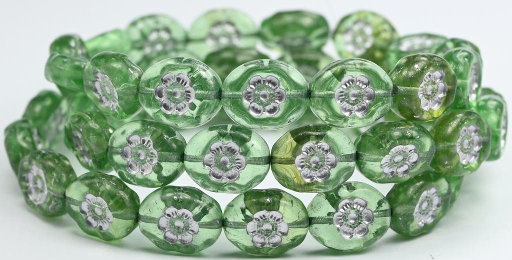楕円形の押しガラスビーズ(花付き)、透明グリーン、シルバーライン(50500-54201)、ガラス、チェコ共和国