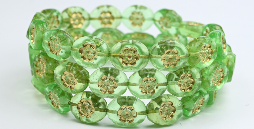 楕円形の押しガラスビーズ(花付き)、透明グリーン、ゴールドライン(50500-54202)、ガラス、チェコ共和国