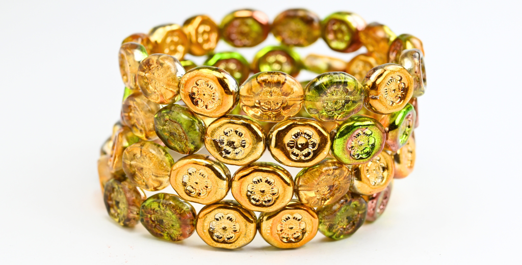 楕円形の押しガラスビーズ(花付き)、543006(543006)、ガラス、チェコ共和国