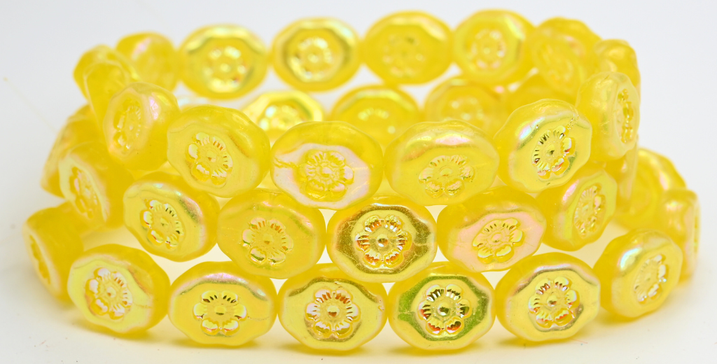 楕円形の押しガラスビーズ(花付き)、透明イエローAB 2X(80030-AB-2X)、ガラス、チェコ共和国