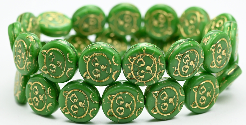 猫の口輪コインビーズ、グリーンマラカイトゴールドライン(54110-54202)、ガラス、チェコ共和国~STRANDED