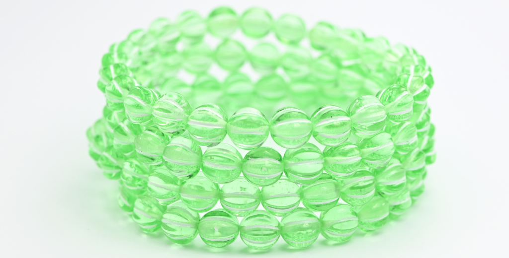 メロン丸型プレスガラスビーズ(ストライプ入り)、透明グリーンホワイトライン入り(50500-46401)、ガラス、チェコ共和国