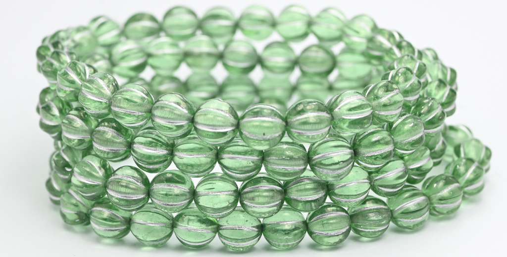 メロン丸型プレスガラスビーズ(ストライプ入り)、透明グリーン、シルバーライン入り(50500-54201)、ガラス、チェコ共和国
