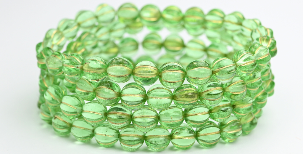 メロン丸型プレスガラスビーズ(ストライプ入り)、透明グリーンゴールドライン(50500-54202)、ガラス、チェコ共和国