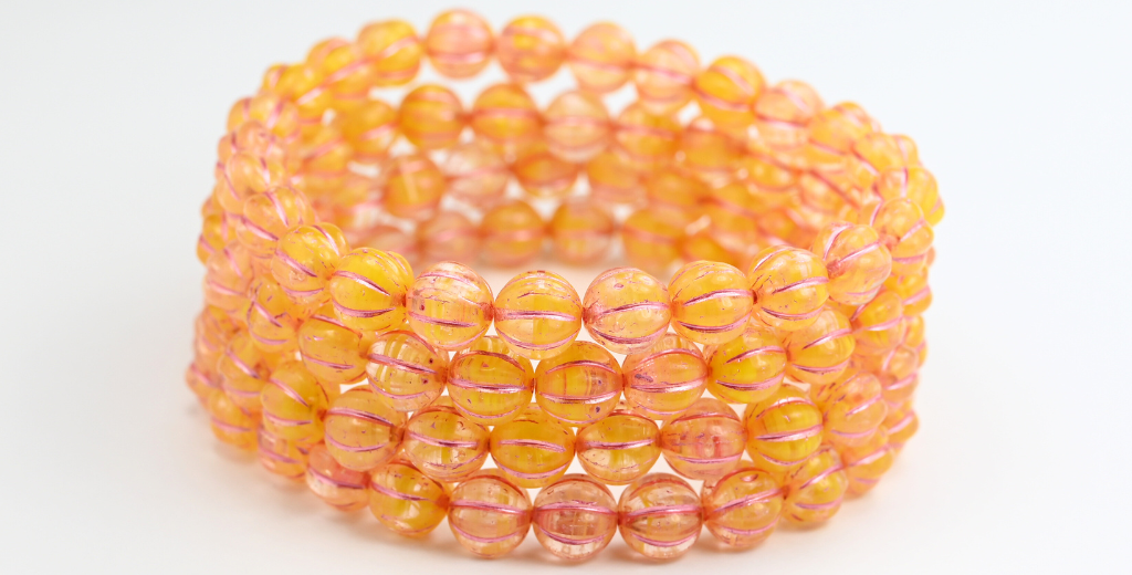 メロンラウンドプレスガラスビーズ(ストライプ入り)、イエローミックスピンクライン(86036S-54321)、ガラス、チェコ共和国