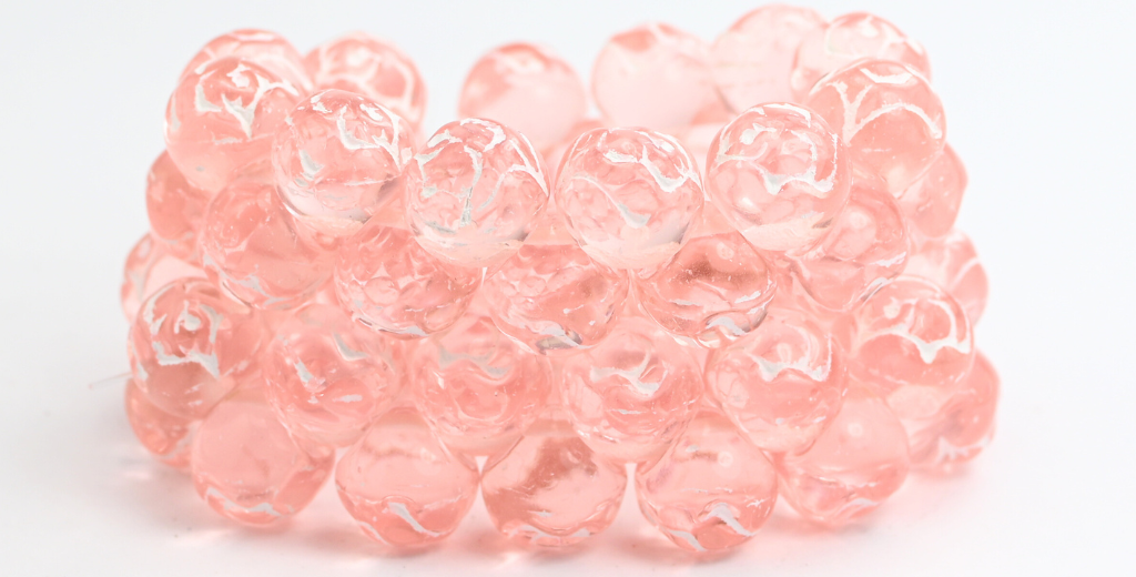 バラの模様が入った丸いプレスガラスビーズ、透明ピンクと白のライン入り(70120-46401)、ガラス、チェコ共和国