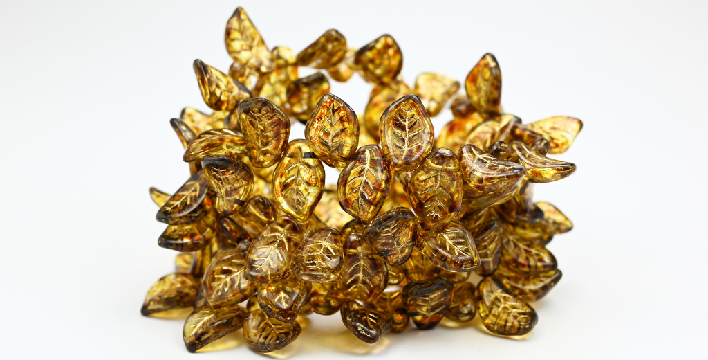 卵形の葉のプレスガラスビーズ、クリスタルトラバーチンゴールドライン(00030-86-54202)、ガラス、チェコ共和国~STRANDED