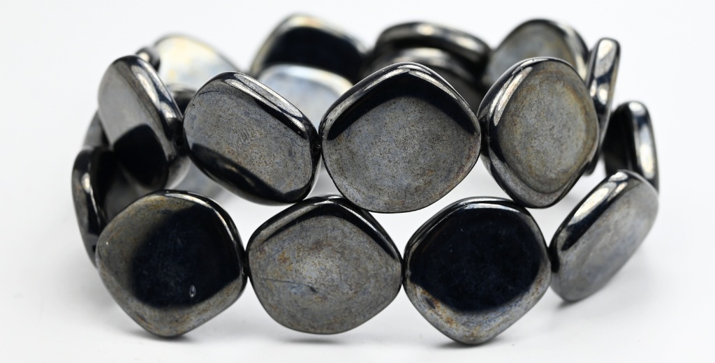 フラットセミラウンドプレスガラスビーズ、ブラックヘマタイト(23980-14400)、ガラス、チェコ共和国~STRANDED