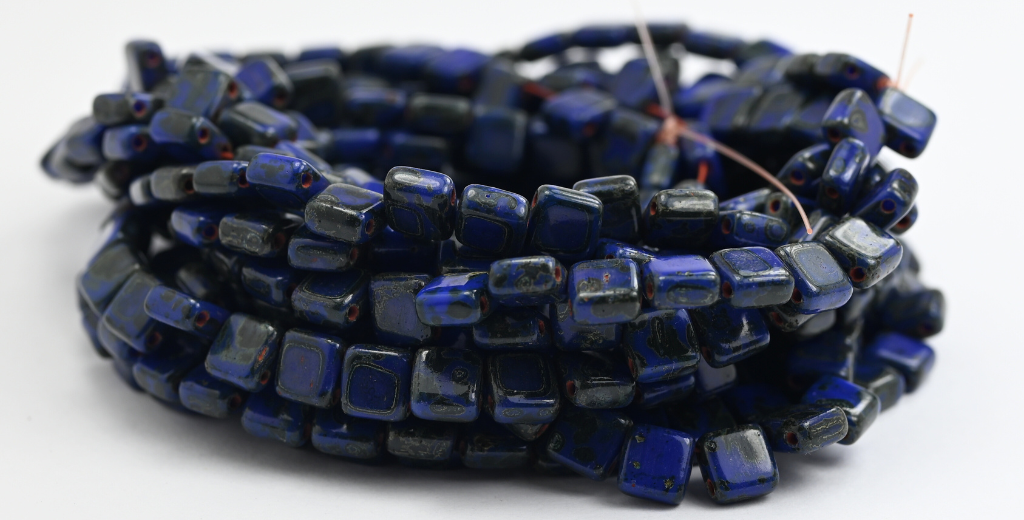 フラットスクエアタイル 2穴プレスガラスビーズ、濃いブルーのトラバーチン(33060-86800)、ガラス、チェコ共和国