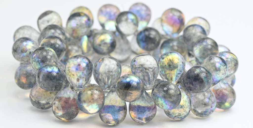 ペアティアドロッププレスガラスビーズ、クリスタルライトグレーAB(00030-34311-AB)、ガラス、チェコ共和国