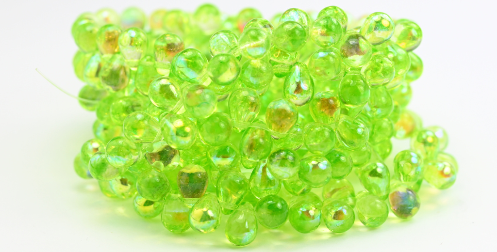 ペアドロッププレスガラスビーズ、クリスタルライトグリーンAb(00030-34310-AB)、ガラス、チェコ共和国
