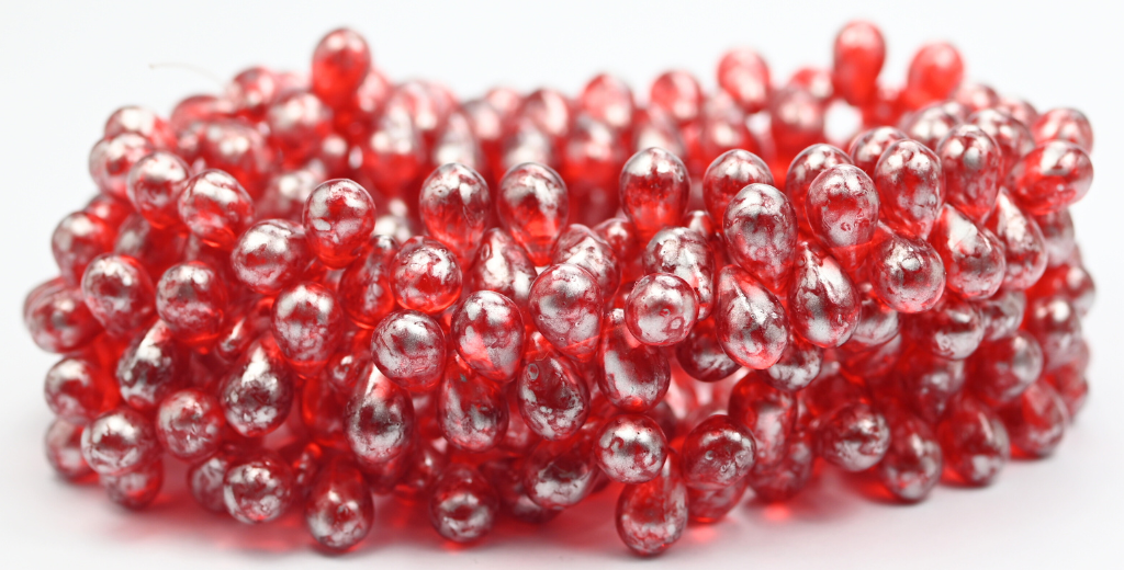 ペアティアドロッププレスガラスビーズ、ルビーレッドシルバースプラッシュ(90080-86700)、ガラス、チェコ共和国〜STRANDED